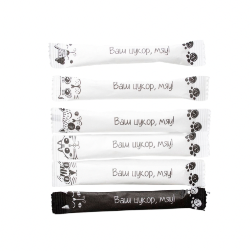 Сахар в стиках «Котики» 1 кг - это удобный и стильный формат порционного сахара для дома, кафе, кофеен, офисов и заведений HoReCa. Упаковка выполнена в оригинальном дизайне в белом и черном цвете с милой надписью «Ваш цукор мяу», которая привлекает внимание и добавляет хорошее настроение.