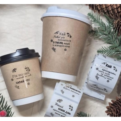 Новогодние наклейки на стаканы - стильный аксессуар, который создаст позитивное настроение у гостей. Белые круглые стикеры с мотивационными надписями легко клеятся на бумажные или пластиковые стаканы, украшая кофе навынос, смузи, лимонады и другие напитки.